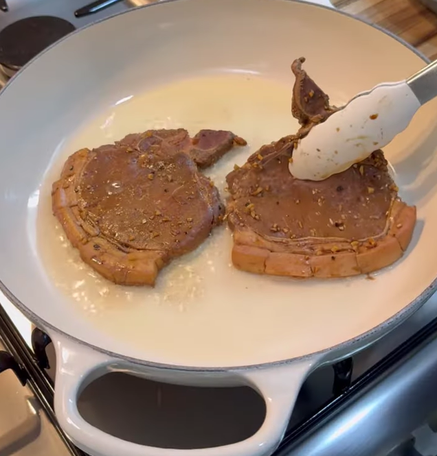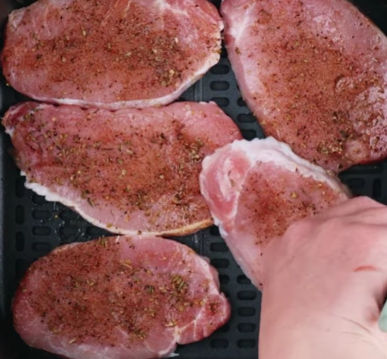 - Season pork chops with pepper.